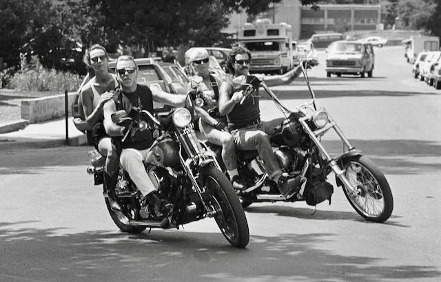 ...pulling around the corner coming into Sturgis during August of 1990, Gregg & crew riding from Rapid City on a day off ... a tattoo artist from Indiana named Roy Boy hooked GA up with a springer softail for a ride to Sturgis & back... I grabbed a ride along in a mini van with the side door strapped open & I shot the whole trip leaning & focusing & hoping I didn't fall out along the way... Gregg's current wife Danielle was riding on back... as always ...