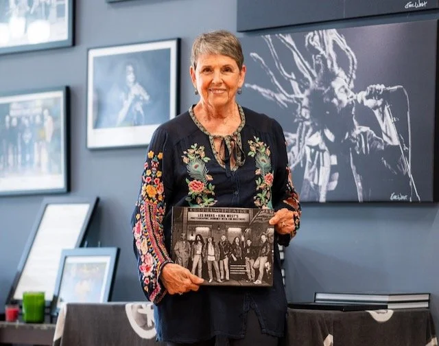 Kirsten West, Godmother of Southern Rock, stands inside Gallery West, co-founded with her husband, photographer Kirk West. Here she holds Les Brers: Kirk West’s Photographic Journey with The Brothers, a visual chronicle of the ABB. Through her stewardship of the gallery, the Big House, and decades of behind-the-scenes dedication, Kirsten has helped preserve not only Kirk’s vast archive but also the living spirit of Macon’s music legacy.