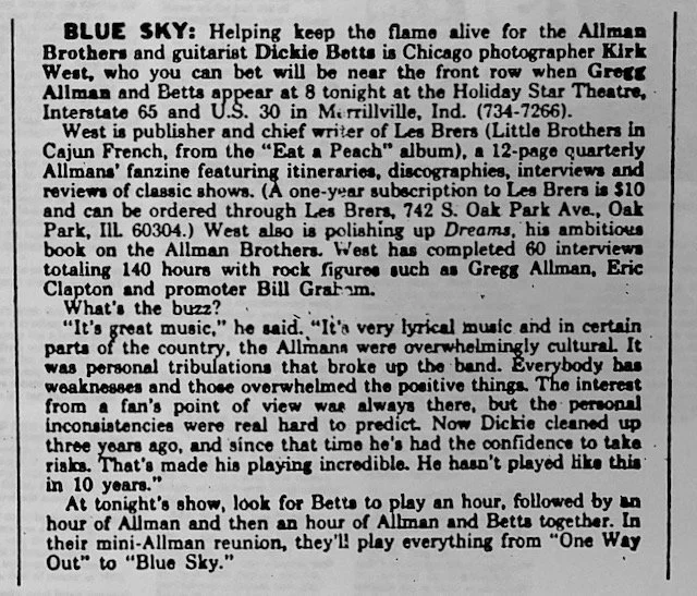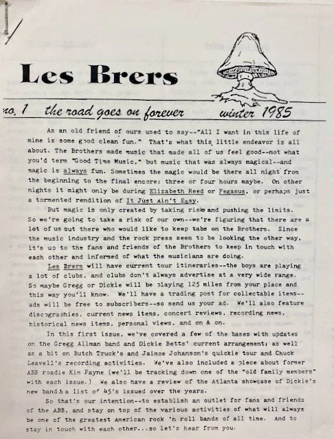 That work laid the foundation for Les Brers, Kirk’s grassroots ABB fan publication that launched with issue #1 in 1985. Part newsletter, part lifeline, Les Brers connected fans across the country and the world through its handwritten notes, tour itineraries, clippings, rare photos, and deep interviews.