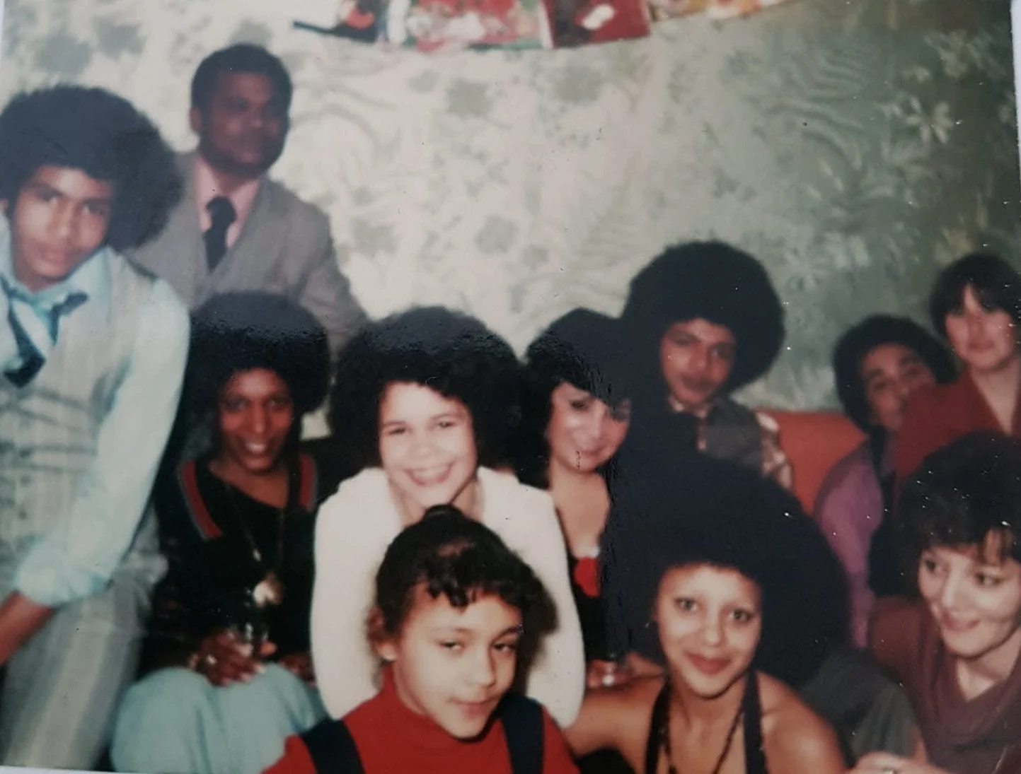 Stephens family gathering, circa 1975 — cousins, parents, and kin filling the frame with laughter and light — and Marie in the center, beaming. The family’s many shades of skin and spirit reflect their shared roots in Jamaica and Liverpool, where love always ran deeper than color.