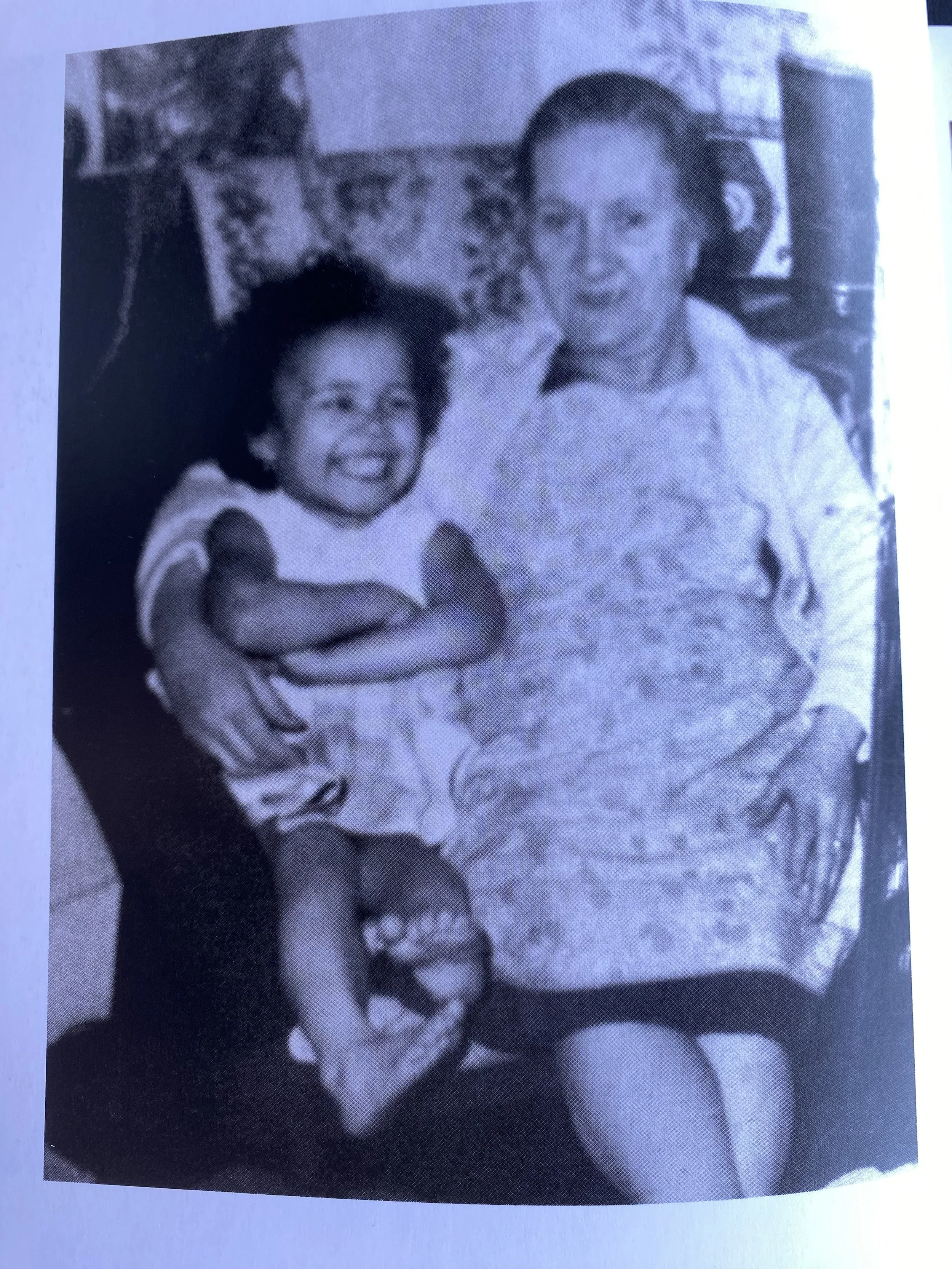 Left Photo: Marie with Mom Babs in Liverpool, circa 1965. Right Photo: Marie’s granddaughter Izzy with a portrait of her Great-Grandfather Roy Stephens.