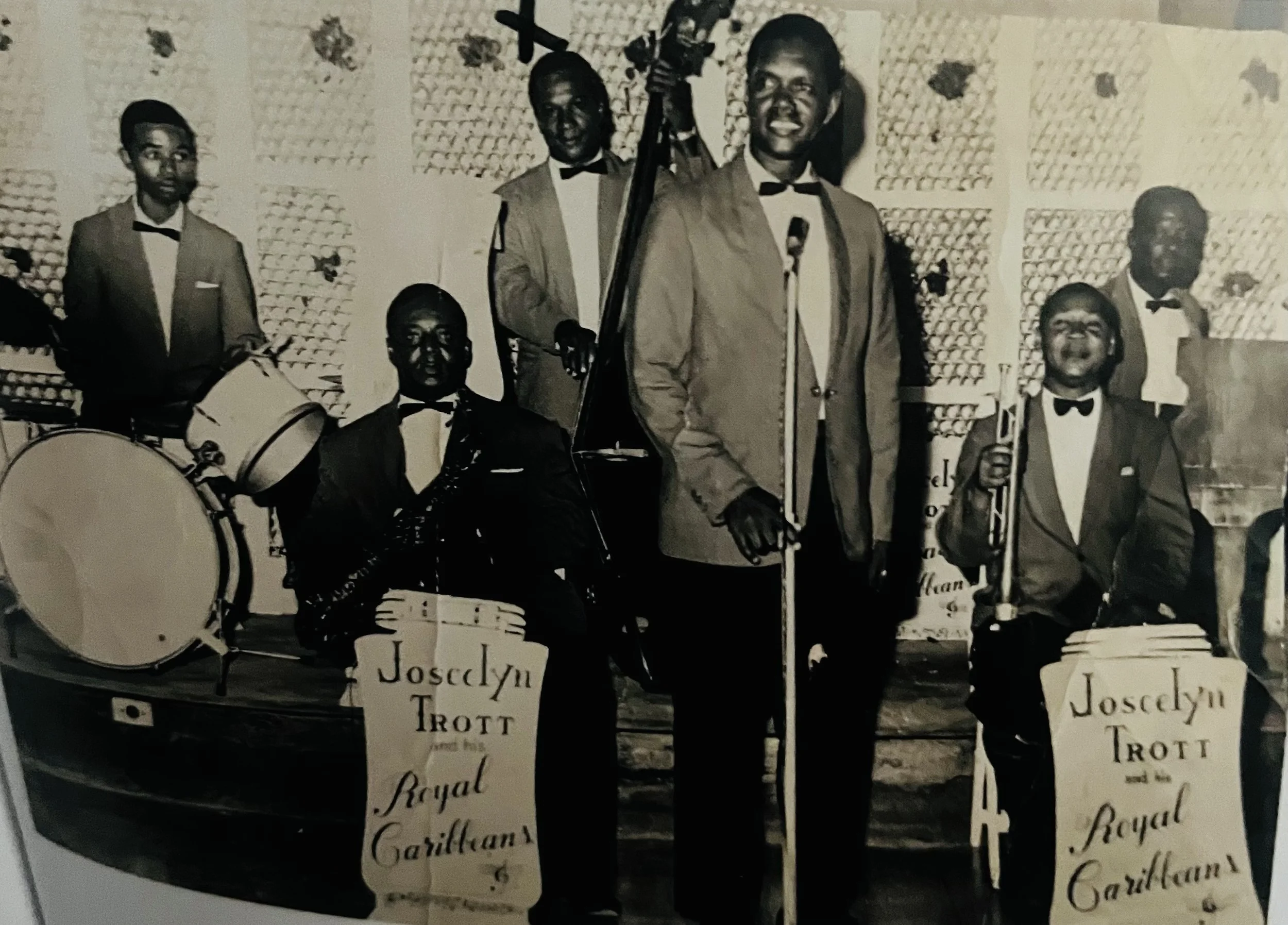 Karl Stephens (X) on double bass with Jocelyn Trott’s Royal Caribbeans — one of Jamaica’s postwar dance bands that kept the island’s rhythm alive as new genres like ska and reggae began to rise. The Stephens family’s musical lineage ran deep — from handmade instruments to professional bandstands.