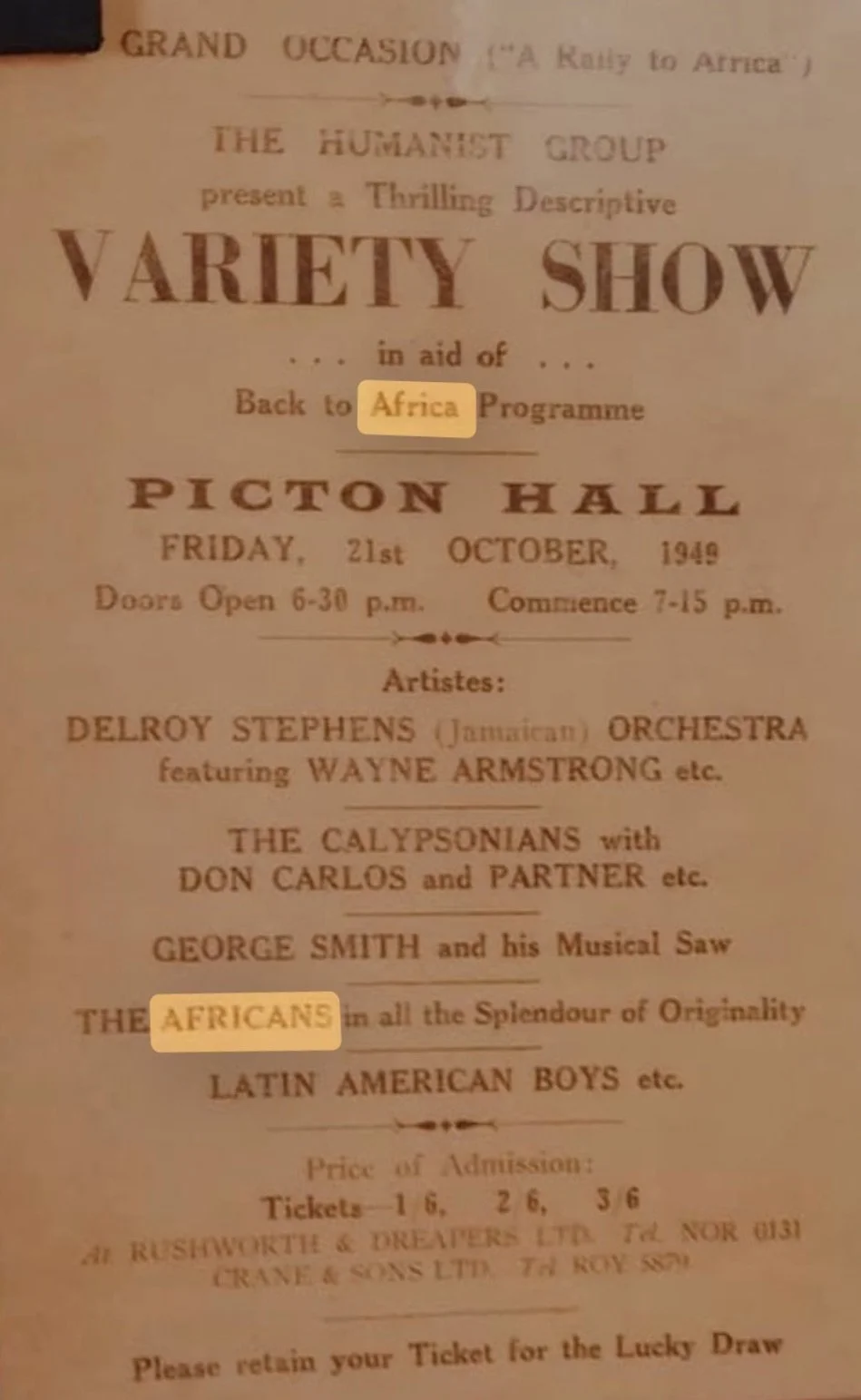 Liverpool, 1949 — A rare surviving flyer shows Delroy Stephens and his Jamaican Orchestra performing at Picton Hall for “A Rally to Africa,” one of the earliest postwar benefit concerts featuring Black musicians in the city. Decades before the Merseybeat boom, the Stephens brothers were already shaping Liverpool’s sound — blending calypso, swing, and Caribbean rhythms that echoed through working-class dance halls and laid the groundwork for the city’s multicultural music legacy.