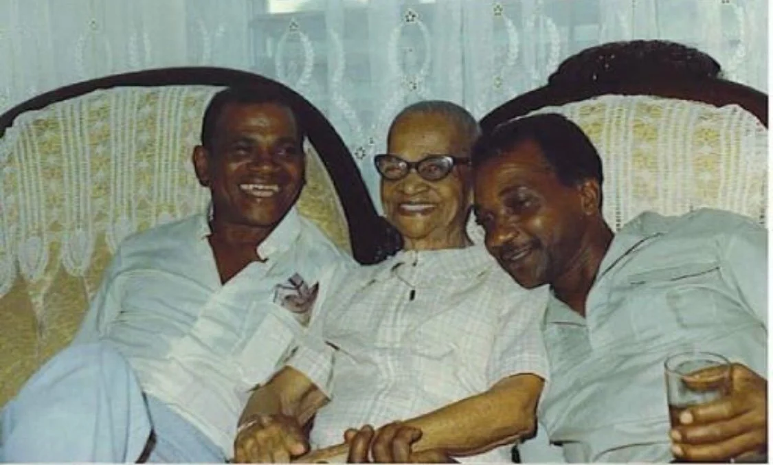 Marie Weatherman Stephens celebrates her 100th birthday in Kingston, Jamaica, 1990, surrounded by her sons Keith (left) and Roy (right). It was a homecoming marked by laughter and legacy — just days after Roy suffered a heart attack en route to the island. Marie lived another four years; Roy only two, their lives forever bound by love and music.